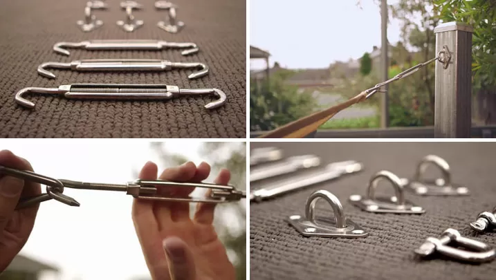 Een schaduwdoek kan eenvoudig bevestigd worden met de bijgeleverde bevestiging set en uitdraaispanners. Deze uitdraaispanners met roestvrijstalen D-ringen worden aangehaakt aan muurplaten of oogbouten. Daarna kan het doek met deze constructie worden strak gespannen. Is er geen muur dichtbij aanwezig? Geen probleem! Wij leveren ook palen die in de grond kunnen worden gezet waaraan de schaduwdoeken vast kunnen worden gemaakt. In de afbeelding bovenaan deze pagina is een goed voorbeeld te zien van bevestiging van zowel aan het huis als aan palen.